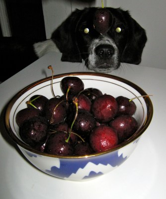 Here are a couple of lucky shots I took late last night. Couple of side notes: he does not eat the cherries just plays with them; the “demon eyes” are a result of crappy camera and evening light.