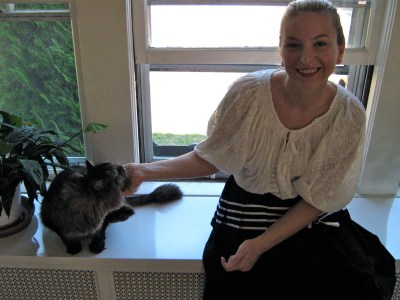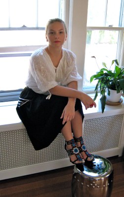 (top: Romanian peasant blouse; belt: Mimi; skirt: Commes des Garcons; sandals: Balmain)