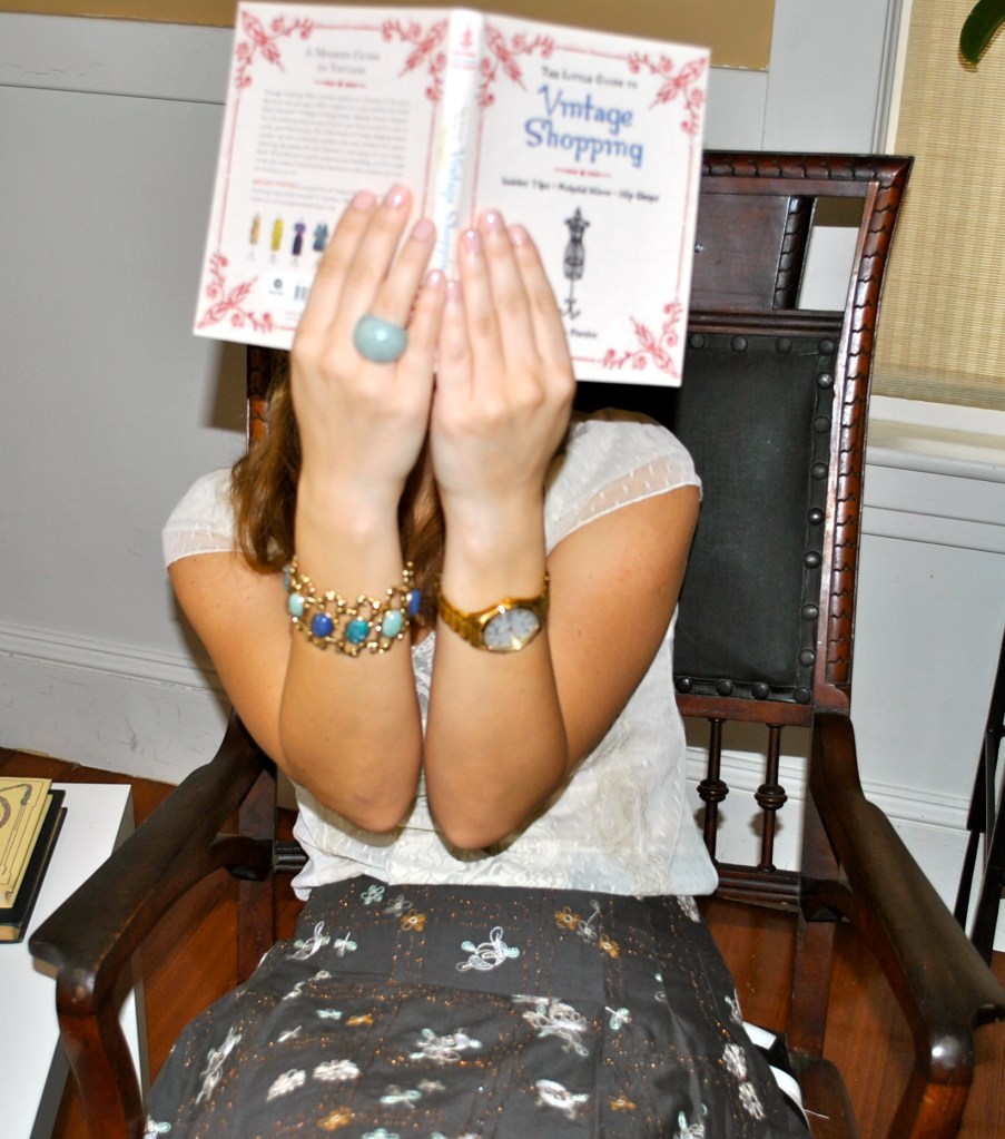 (lace top: Urban Outfitters; skirt: Anne Klein; argyle socks: borrowed from H; bracelet and earrings: vintage; jade ring: gift from H)
