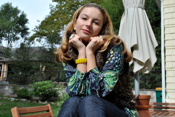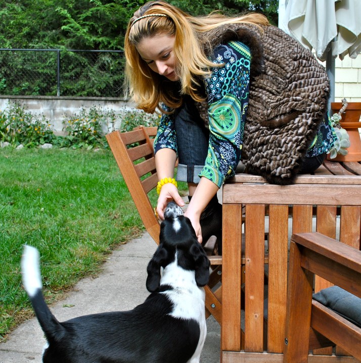 (mesh booties: Martin Margiela; jeans: Citizens of Humanity; mink vest: gift from Mom; blouse: DKNY; yellow cuff: JCrew; fairy ring: Noir)